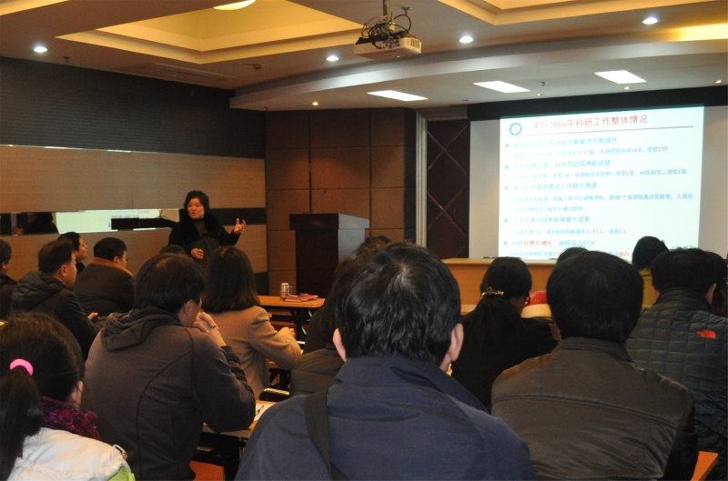庄英萍院长首先向全院教师介绍了学校2016年的整体科研工作形势,并传达了学校科研工作会议精神,然后详细总结介绍了2016年学院的科研工作举措、取得的科研成果及存在的问题。她指出,学院的基础研究能力和原始创新能力有明显提升,代表性科研成果和科研奖励有了新成绩,在高水平人才引进和培养方面也较往年有明显成效,2016年全院教师齐心协力备战生物反应器工程国家重点实验室迎评估取得了阶段性成果,省部级科研基地又有新收获,但学院到款科研经费形势比2015年有明显下降。在此形势下,学院根据学校的统一部署和要求,制定了2017年学院科研工作计划和任务要求,要求全院教师能够牢牢抓住国家创新驱动力大战略和大形势的有利时机,激发创新活力,充分释放政策红利,为实现学院和学校科研工作目标做出实际贡献。