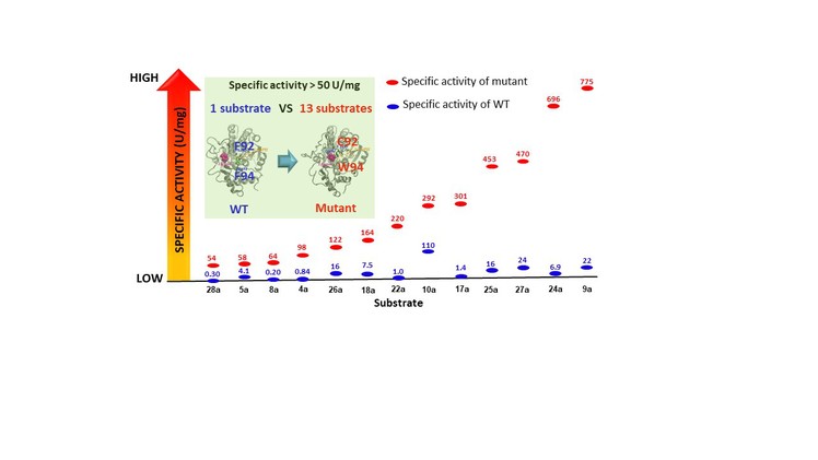 近年来,我国传统的化学化工及相关制造业面临着巨大的环保压力和节能减排的挑战,以工业酶为核心的生物合成技术,可以显著降低生产过程中的资源与能源消耗,减少污染物的排放,成为了企业创新驱动、转型发展、依法减排所亟需的的先进制造技术。然而天然来源的酶通常无法满足实际应用环境中的苛刻条件,因此需对其工业应用性能进行提升。针对野生型羰基还原酶CgKR1底物谱不够宽、催化活性不够高的缺陷,研究人员基于分子动力学模拟分析和长期的研究工作积累,推断出酶的底物通道上可能影响活性的两个关键氨基酸残基Phe92和Phe94;通过对酶进行结构改造,获得了一个对28种羰基底物催化活性显著提高的突变体CgKR1-F92C/F94W,并成功用于多种药物手性中间体的扩大制备。这一广谱、高效的生物催化剂为 一本道