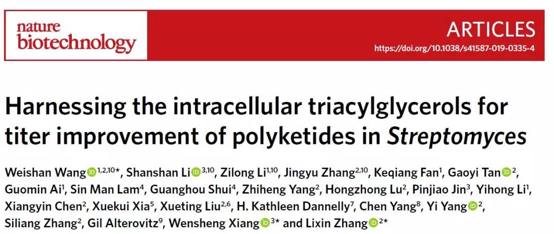 生物反应器工程国家重点实验室主任张立新教授,联合中国科学院微生物研究所王为善研究员和中国农业科学院植物保护研究所向文胜研究员,在链霉菌胞内三酰甘油(TAGs)降解机理研究中取得突破性进展,在国际权威学术期刊Nature Biotechnology杂志上以长篇论文(article)形式在线发表题为 “Harnessing the intracellular triacylglycerols for titer improvement of polyketides in Streptomyces” 的文章。