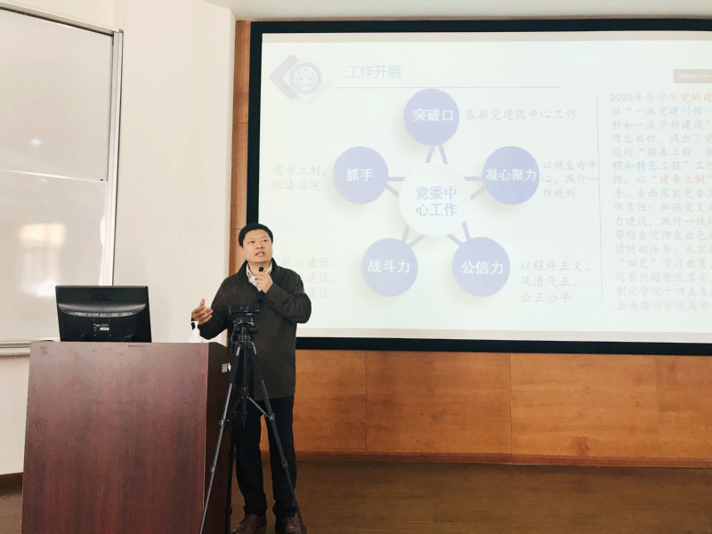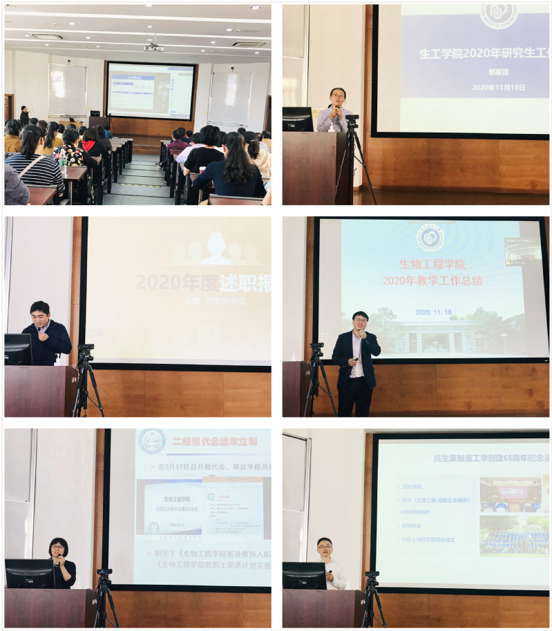 会上,赵黎明向全院教职工简介了学院领导班子述职的意义,随后副院长、生物反应器工程国家重点实验室主任张立新,副院长郁惠蕾,党委副书记左鹏,副院长王启要,工会主席蔡海波,党委副书记陆兵分别就学院科研和国重室工作、研究和学科工作、学生工作、本科教学工作、工会工作、校友和安全及教师思政工作做了总结汇报。党委副书记、院长庄英萍作了学院行政工作报告,全面回顾总结了2020年学院各项工作,并介绍了学院“十四五”规划的重要目标任务。最后赵黎明作学院党委工作报告,从目标、举措、成效的角度,简明扼要介绍了学院党委一年来的工作思路、重点工作和亮点特色工作,同时他代表学院对学院全体教职工一年来在疫情防控和教学科研、立德树人等各方面的辛勤付出表示衷心感谢,他指出“十四五”对学院来讲至关重要,是将学院发展的重要历史时期,鼓励全体教职员工为全面推进学院高质量发展不断努力。