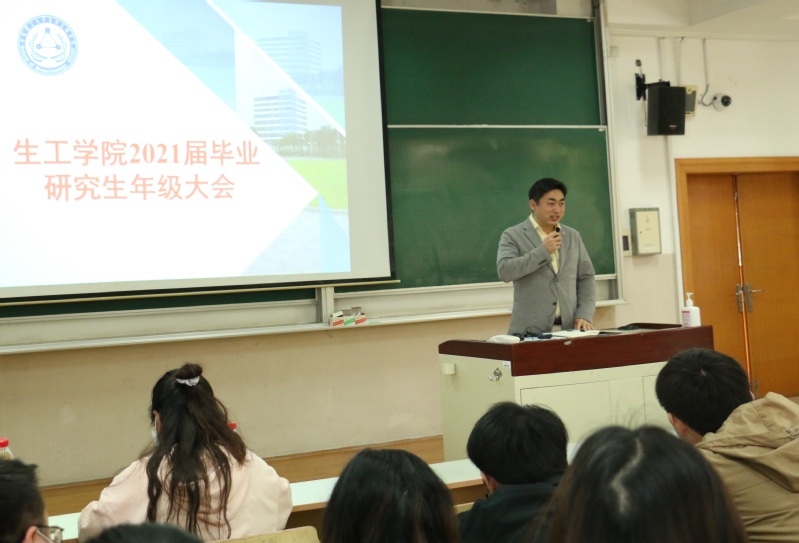 会上,左鹏副书记为毕业生做就业工作动员,并强调了安全事项。面对当下后疫情时代紧迫的就业形势,左老师一方面鼓励大家拒绝观望、尽早行动,求职路上稳扎稳打;另一方面提醒大家求职过程中注意防范网络诈骗,保障人身和财产安全。最后,左老师还嘱咐毕业生在各行各业的岗位上发扬学院的抗生素制造精神,做好学院的文化传承。