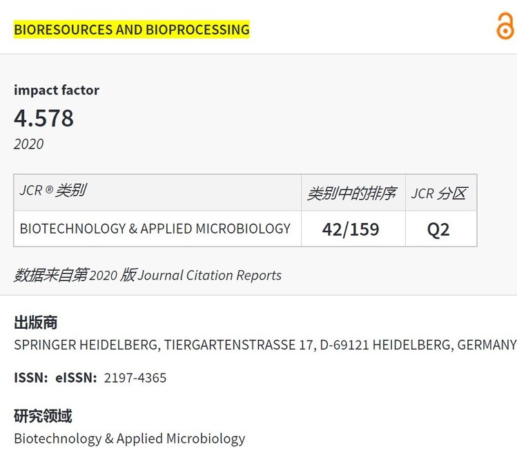 2021年6月30日,科睿唯安公司公布了2020年SCI收录期刊的最新影响因子,其中我校自主创办的英文期刊《Bioresources and Bioprocessing》(《生物资源与生物加工》,简称“BIOB”)经过近八年精心培育,正式获得了首个影响因子4.578,在生物技术与应用微生物学领域位居JCR Q2区前列,明年有望进入JCR Q1区。这标志着 一本道