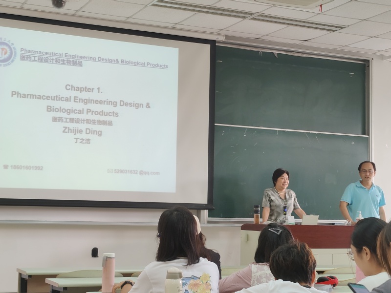 1982级校友、上海临港新片区生命蓝湾专家顾问、天俱时工程科技集团有限公司副总裁、生物医药事业部董事长、知名工程设计专家、教授级高级工程师丁之洁女士走进奉贤校区教室B101,为2021级生物与医药专业硕士研究生讲授《生物制药工业设计》课程,第一堂课为同学们讲授“医药工程设计和生物制品”的相关知识和最新行业进展。