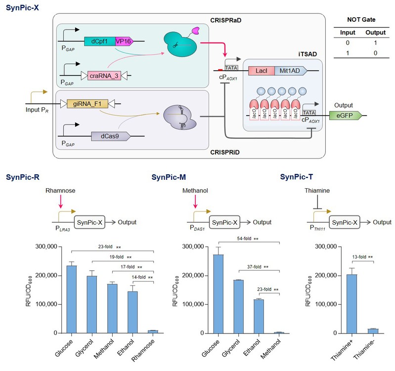 该研究中,作者基于合成生物学理念,通过分析毕赤酵母天然转录调控网络并重塑转录调控机器,设计了一套具有高强度表达能力的转录信号增益器件iTSAD,实现输入信号的高效放大,达到商业化毕赤酵母PAOX1表达强度的5.2倍。但是,随后作者发现,由于iTSAD对低输入信号过强的增益效果,导致其介导的渗漏表达水平较高,因而难以实现严谨调控。针对该问题,作者基于CRISPR基因调控技术,设计CRISPRi阻遏器件以解决iTSAD高渗漏表达问题,并设计CRISPRa激活器件以抵消CRISPRi的高限表达压制,以此可响应灵活、低强度输入信号而协同控制iTSAD器件,有效解决了iTSAD的高渗漏表达问题,并通过对引导RNA组合的理性设计和筛选验证,实现完整系统的高强度表达输出。由此,最终作者成功开发了具有高强度、低渗漏、可编程特性的合成型毕赤酵母表达平台SynPic-X,并通过简单地“插拔”单一低输入启动子即可实现响应用户自定义信号的高水平蛋白表达和严谨调控。在此基础上,作者针对不同类型的输入启动子对该表达平台进行了检验,分别构建了鼠李糖信号响应系统SynPic-R、甲醇信号响应系统SynPic-M和硫胺素信号响应系统SynPic-T,均可实现对特定信号的严谨调控和高效响应,在激活状态下分别达到商业化毕赤酵母PAOX1表达强度的3.8倍、4.4倍和3.3倍。为了测试SynPic-X平台的实际应用价值和潜力,作者选取鼠李糖信号响应开关SynPic-R用于驱动工业淀粉酶的表达,在3升反应器水平得到了与商业化毕赤酵母PAOX1甲醇诱导表达相当的产量,且生产工艺控制更为绿色、安全、简便,展现了良好的工业应用前景。