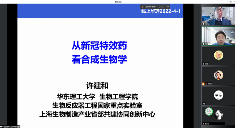 许建和介绍了新冠病毒的结构及特效药物,并由此引出了合成生物学技术。许建和讲到,合成生物学是生物制造产业颠覆性的技术,其重点专项是新分子生化反应设计与合成生物系统的构建,包括设计新分子、创制新元件、建构新途径、创建新工艺。他还以紫杉醇和薄荷醇为例,更具体地讲解了合成生物学技术的应用。