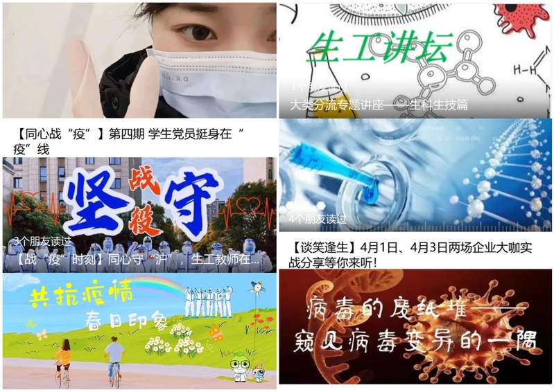 充分重视网上思政工作,“华理生工园”微信公众号、B站、QQ空间等多平台联动,搭建新时代下的新媒体矩阵,以突出学院特色、增进师生联系、引领网络思潮为宗旨。将校院活动、信息预告、学术交流、时事热点等内容进行实时报道,开设【科普科创】、【同心战“疫”】、【战“疫”时刻】、【共抗疫情、春日印象】系列。既以百花齐放的活动传递院校温情,又生动展现了疫情期间生工学子“只要疫情不退,志愿服务不停”的真情奉献,和冲锋在前的精神面貌,塑造了生工学院花生宝豌豆君的经典形象,获得2021年度新媒体应用先锋。