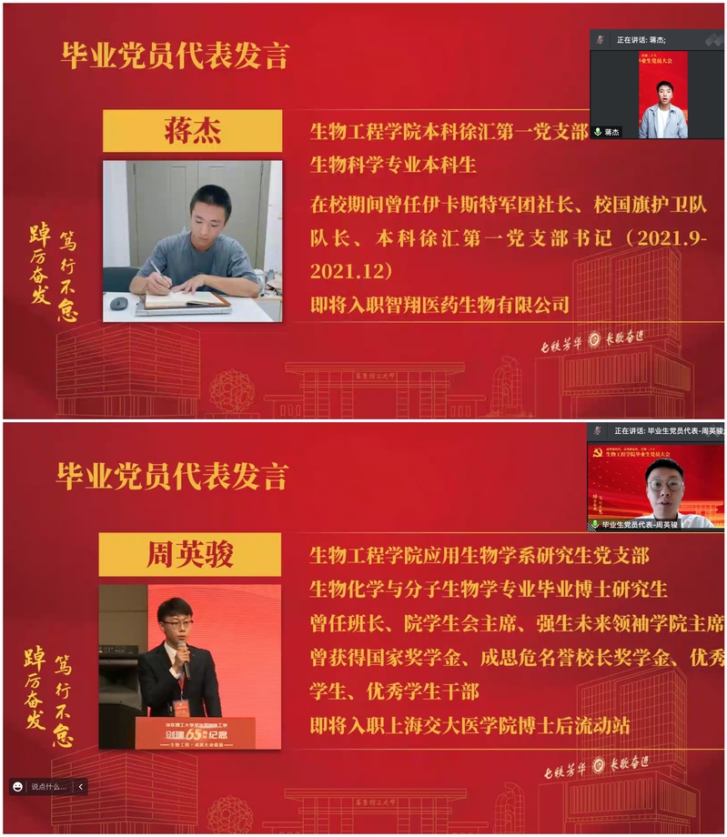 本科毕业生党员代表蒋杰分享了作为志愿者参与到疫情防控一线工作的经历。他表示,作为一名退伍军人和共产党员,自己始终不忘初心、牢记使命,越是艰难,共产党员越要顶住压力,迎难而上,在祖国和人民最需要的时候,彰显共产党员的责任和担当。研究生毕业生党员代表周英骏向学院表达了诚挚的感谢,并分享了自己在华理九年的精彩和感动。周英骏表示,今后一定牢记恩师们的谆谆教诲,秉承“勤奋求实、励志明德”的校训,在学思践悟中坚定理想信念,在奋发有为中践行初心使命,在勤学苦干中实现“请党放心,强国有我”的承诺。
