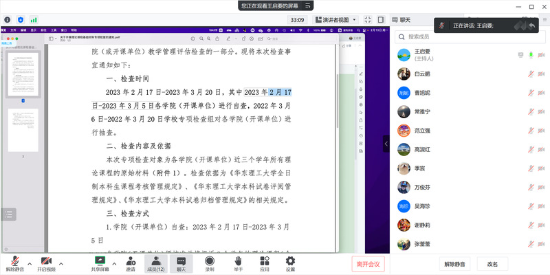 于2023年2月13日组织召开线上本科评估工作会议,学院各系主任、副主任、本科教学工作教师骨干、教务员等参加了此次会议。会议由教学副院长王启要主持。