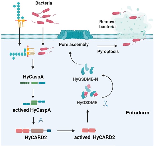 图片说明:水螅HyCaspA-HyCARD2-HyGSDME级联信号通路介导的焦亡机理图