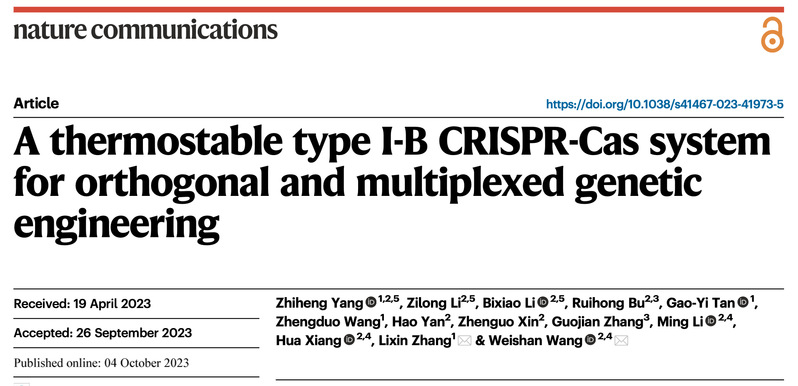 生物反应器工程国家重点实验室张立新教授和中国科学院微生物研究所王为善研究员合作在Nature旗下期刊《Nature Communications》上发表题为“A thermostable type I-B CRISPR-Cas system for orthogonal and multiplexed genetic engineering”的研究论文。这项研究开发了一种高度热稳定的Type I-B CRISPR-Cas系统,为高温菌的基因工程和转录调控提供了全新的工具。