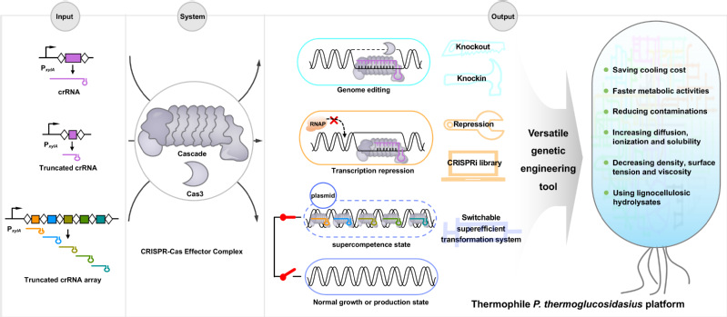在过去的几年里,合成生物学推动了绿色、低碳生物制造产业的高速发展,如何进一步引领下一代更有前景的“菌种—工艺—装备”一体化创制?该团队注意到嗜热微生物有潜力作为下一代工业生物技术的优势底盘,具有可开放式发酵减少灭菌成本,降低生物反应器冷却成本,减少发酵液的粘度、增加传质、加速生物转化速率等优点,在工业生产中具有巨大的潜力。然而遗传操控工具的匮乏制约了高温底盘细胞的应用。CRISPR-Cas系统已经在生命科学领域掀起了一场革命,成为了基因编辑和基因工程领域的一项关键技术。虽然CRISPR-Cas系统在常温条件下表现出色,但对于嗜热微生物的应用却一直受限。