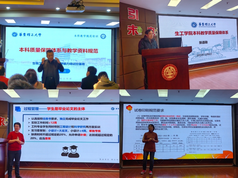 培训邀请了学校第四届本科教育教学督导专家张惠展、张道敬,应用生物学系主任吴海珍,食品科学与工程系副主任曹旭妮四位老师就课堂教学、教学质量保障体系、毕业论文规范和试卷规范进行了专项培训。
