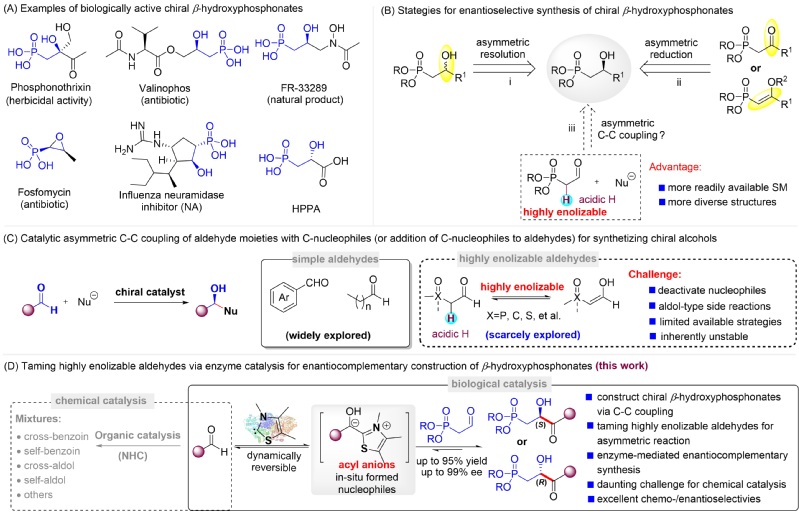 张立新团队解永涛组提出了碳碳键偶联的策略用于高效构筑β-手性羟基膦酸酯——亲核试剂对高烯醇化的2-膦酸酯乙醛进行不对称加成。理论上该策略是β-手性羟基膦酸理想的合成方法(原料廉价易得、产物结构容易多样化),但确面临很大的挑战:(1)高烯醇化醛α位的氢具有较强酸性,可以导致亲核试剂的失活;(2)高烯醇化醛容易发生aldol类型的副反应;(3)缺乏有效的“驯服”高烯醇化醛的不对称合成策略;(4)高烯醇化醛自身的不稳定性。