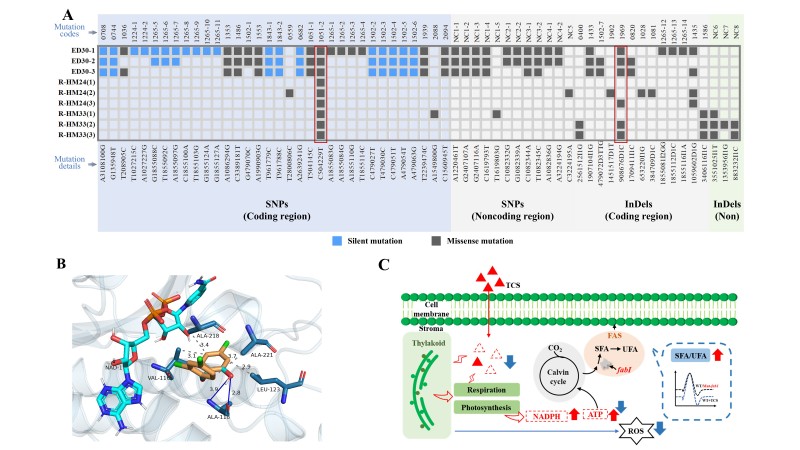 图片说明:A. 全基因组重测序结果的可视化;B. TCS与fabI 的对接结果; C. 工程藻株对TCS的耐受机制分析