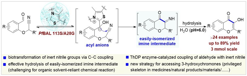 很多药物和天然产物的分子骨架,都依赖于碳原子之间手拉手形成“碳-碳键”。在生物催化领域,有一类叫做“ThDP依赖型酶”的“分子工匠”,它们擅长把醛基作为“抓手”来构建碳-碳键,但它们的“工作清单”里一直有个空白——不会处理惰性的氰基。这项研究的巧妙之处,就是成功改造了一种ThDP依赖型酶,教会它把醛基加到氰基上。这是首次实现这类酶催化的醛基对氰基分子内加成反应,相当于把酶催化碳-碳键构建的能力,从“舒适区”拓展到了原本很难攻克的惰性氰基体系。